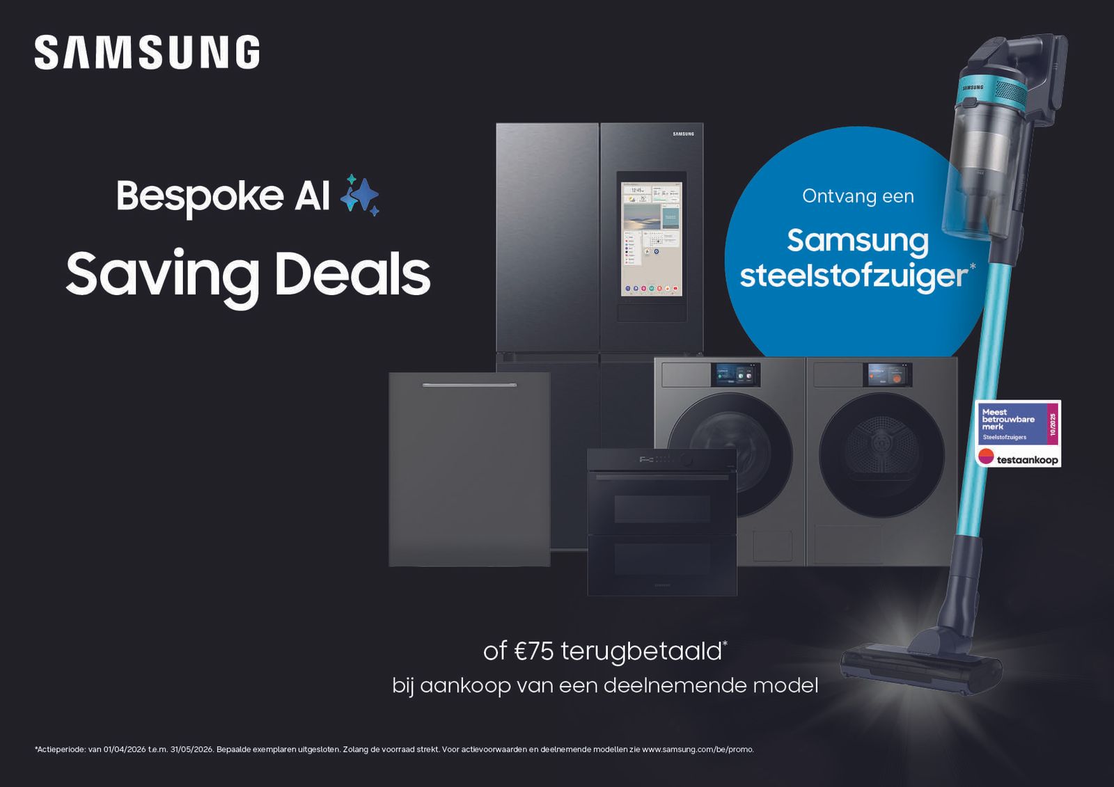 Tijdens de actieperiode van april ontvangt u bij de aankoop van een Samsung toestel een gratis Samsung JET60 steelstofzuiger (of € 75 terugbetaald) cadeau.